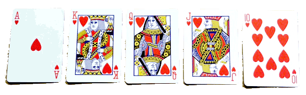 Quinte flush royale : une main formée d’un as, d’un roi, d’une dame, d’un valet et d’un 10 de la même couleur